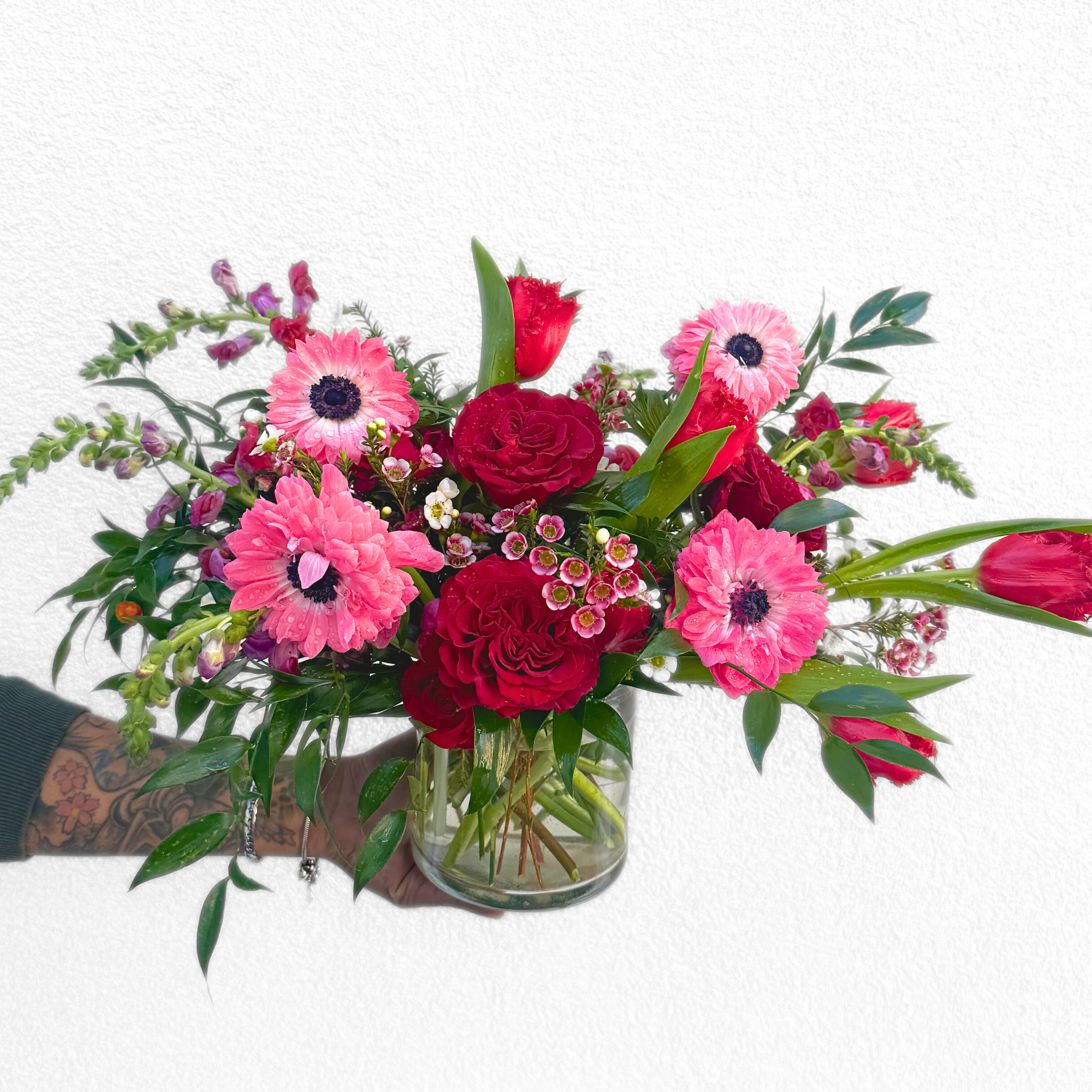 Our arrangements are created by our team of designers, each bringing their own artistic style to the palette. Expect variation in composition while maintaining the intended color story and feel. The flowers used in this photo are for inspiration; exact varieties may vary based on market availability and the season.