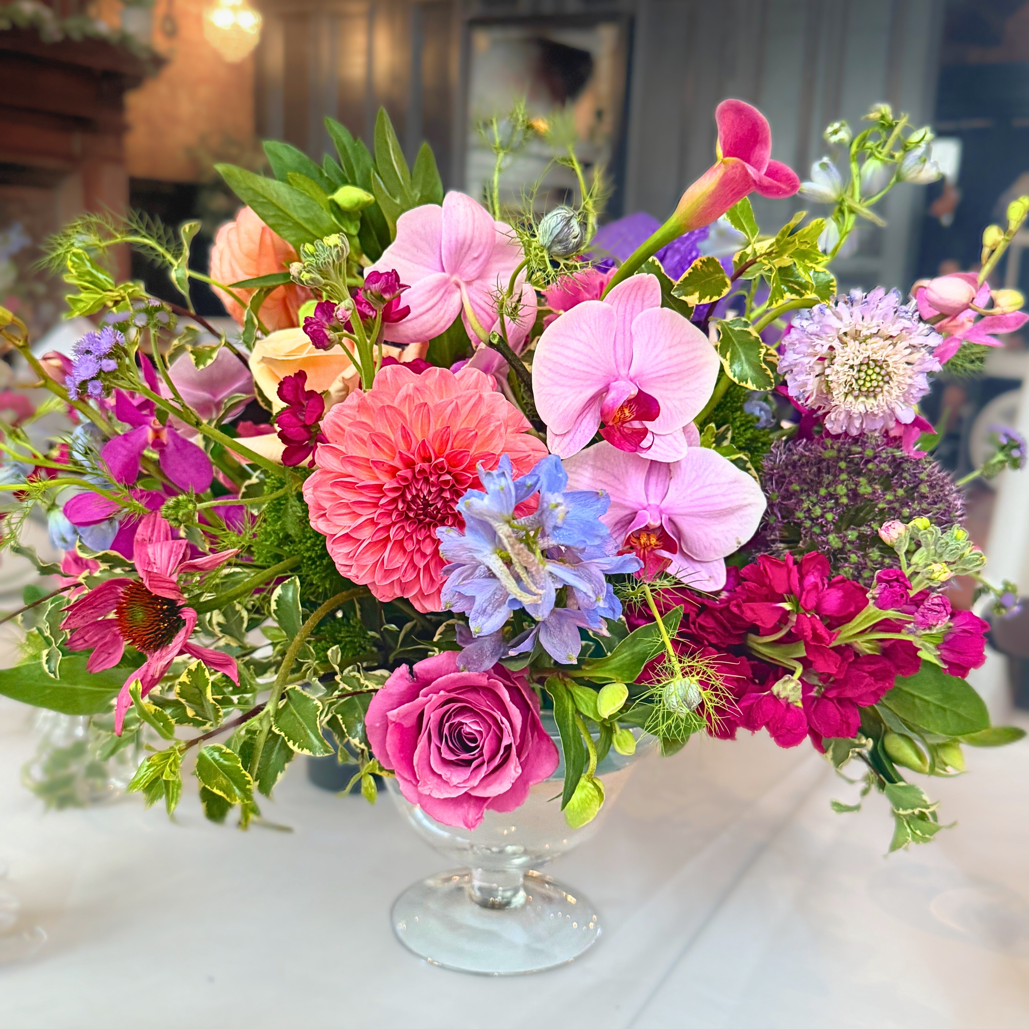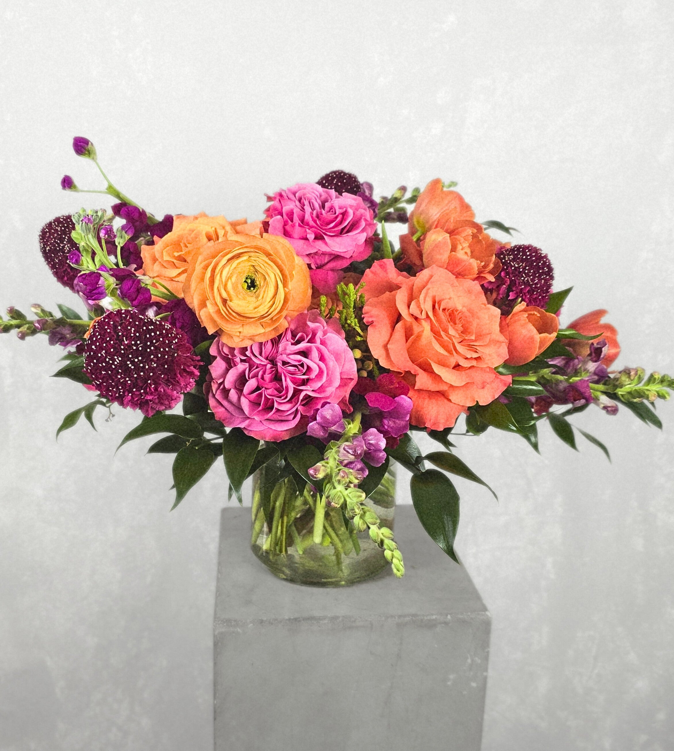 Our arrangements are created by our team of designers, each bringing their own artistic style to the palette. Expect variation in composition while maintaining the intended color story and feel. The flowers used in this photo are for inspiration; exact varieties may vary based on market availability and the season.