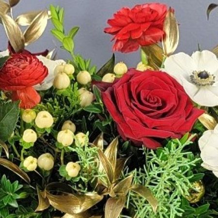 Our arrangements are custom-designed in glass cube or cylinder and are intended to be placed in the center of a table, coffeetable or kitchen island. Choose your palette - wintergreens with traditional red and green flowers or mostly white or red flowers with a pop of holiday color.